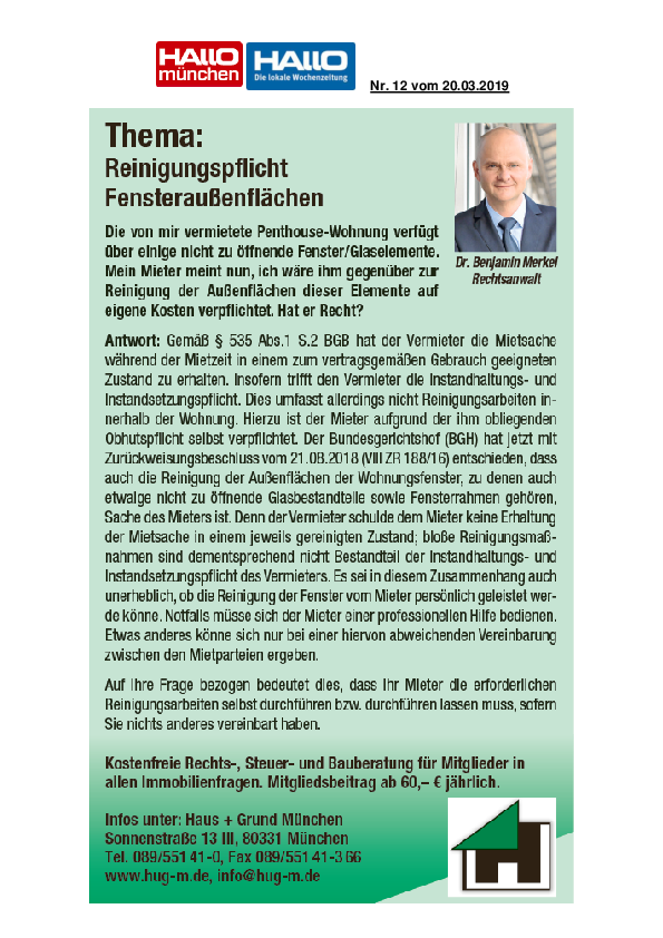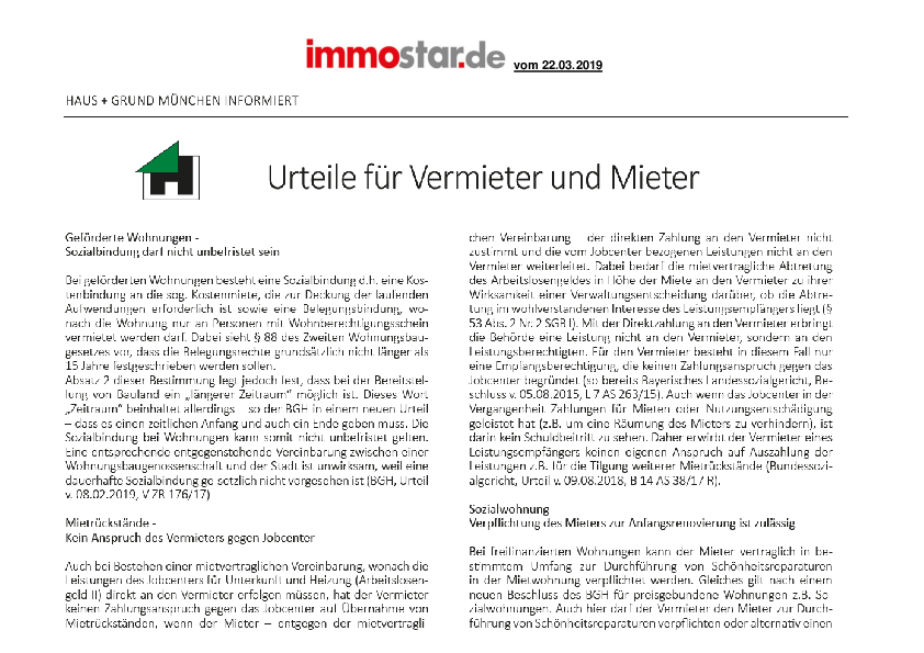 Geförderte Wohnungen - Sozialbindung darf nicht unbefristet sein // Mietrückstand - Kein Anspruch des Vermieters gegen Jobcenter // Sozialwohnung - Verpflichtung des Mieters zur Anfangsrenovierung ist zulässig // Geschäftsräume - Mieteingang am dritten Werktag kann wirksam vereinbart werden // Musizieren - Des einen Freund, des anderen Leid // Wohnungsmietvertrag - Zusätzliche Verwaltungskostenpauschale ist unzulässig // Heizkosten - Mieter hat Anspruch auf Änderung von falschem Verteilungsschlüssel // Vertragswidrige Nutzung - Keine Verjährung des Unterlassungsanspruchs bei fortdauernder Nutzung // Miteigentum - Anteilsverkäufer bleibt Vermieter