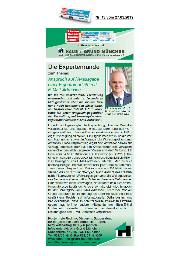 Anspruch auf Herausgabe einer Eigentümerliste mit E-Mail-Adressen