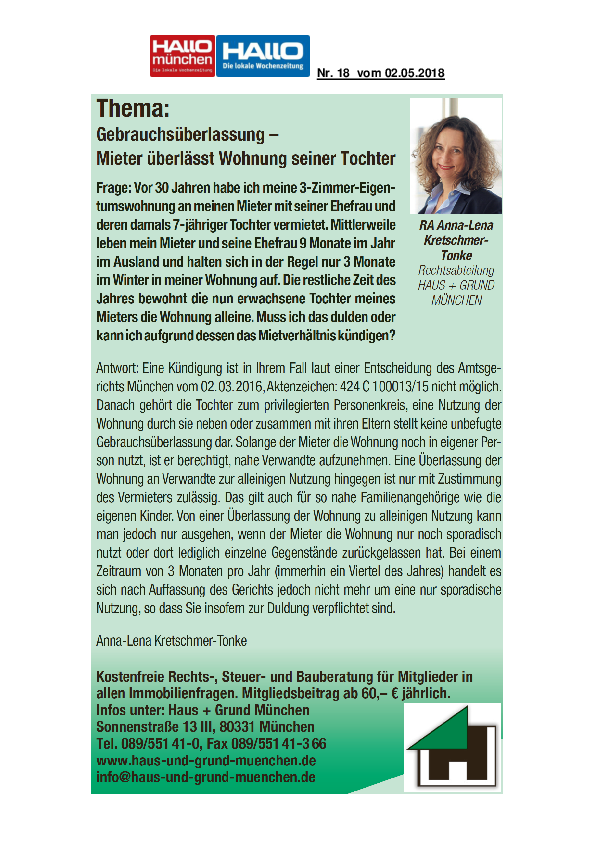 Gebrauchsüberlassung – Mieter überlässt Wohnung seiner Tochter