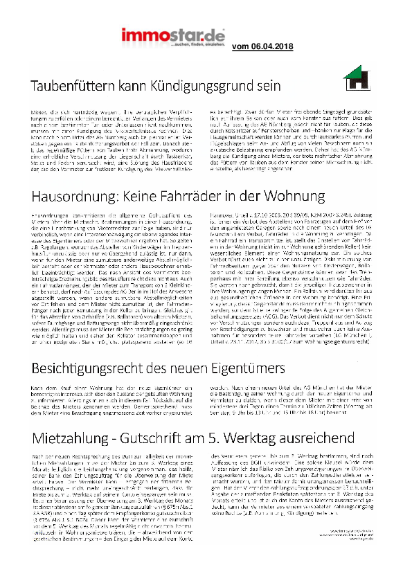 Taubenfüttern kann Kündigungsgrund sein // Hausordnung: Keine Fahrräder in der Wohnung // Besichtigungsrecht des neuen Eigentümers // Mietzahlung – Gutschrift am 5. Werktag ausreichend