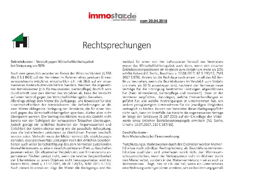 Geschäftsräume – Betriebspflicht kann wirksam vereinbart werden // Markise – Hat der Mieter Anspruch auf Genehmigung? // Fristlose Kündigung bei Gewalttätigkeiten u. Bedrohung // Betriebskosten – Verstoß gegen Wirtschaftlichkeitsgebot bei Steigerung um 50 % // Geschäftsräume – Kein Mieterschutz bei Firmenwohnung // Beweissicherung – Sachverständigengutachten ist verbindlich