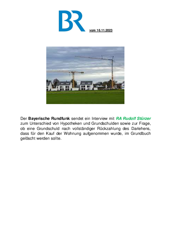 Der Bayerische Rundfunk sendet ein Interview mit RA Rudolf Stürzer zum Unterschied von Hypotheken und Grundschulden sowie zur Frage, ob eine Grundschuld nach vollständiger Rückzahlung des Darlehens, dass für den Kauf der Wohnung aufgenommen wurde, im Grundbuch gelöscht werden sollte.