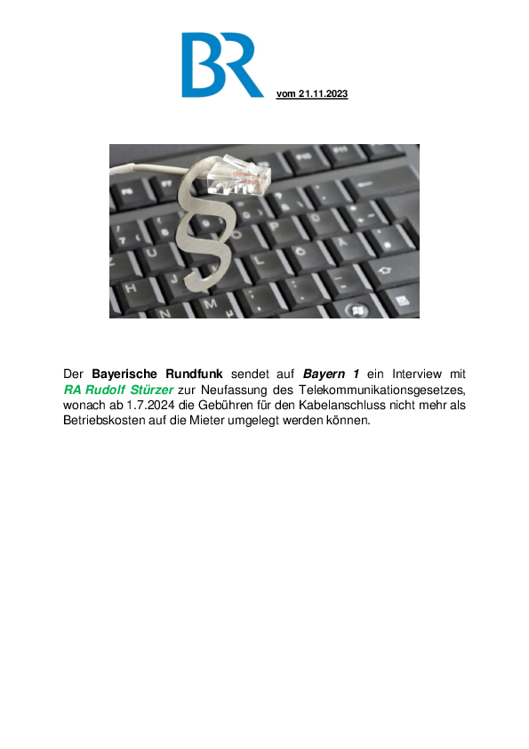 Der Bayerische Rundfunk sendet auf Bayern 1 ein Interview mit RA Rudolf Stürzer zur Neufassung des Telekommunikationsgesetzes, wonach ab 1.7.2024 die Gebühren für den Kabelanschluss nicht mehr als Betriebskosten auf die Mieter umgelegt werden können.