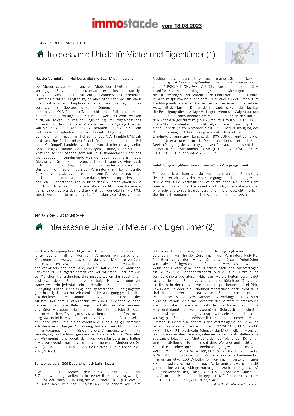 Nackter Vermieter im Hof berechtigt nicht zur Mietminderung // Beleidigung als „dümmliche Schlampe“ ist Kündigungsgrund // Schadensersatz - 200 Dübel sind noch kein „Exzess“ // Eigenbedarf - Zweifel bei Verhandlungen über Miethöhe // Wasserschaden - Fristlose Kündigung bei erheblich verspäteter Schadensmeldung // Gasheizung vom Vormieter übernommen - Vermieter trägt Kosten der Erneuerung // Zweifamilienhaus - Kein Sonderkündigungsrecht bei nur gelegentlicher Nutzung // Ausnahme von Mietpreisbremse - Angabe der Quadratmetermiete genügt // Keine Kündigung trotz unhaltbarem Betrugsvorwurf