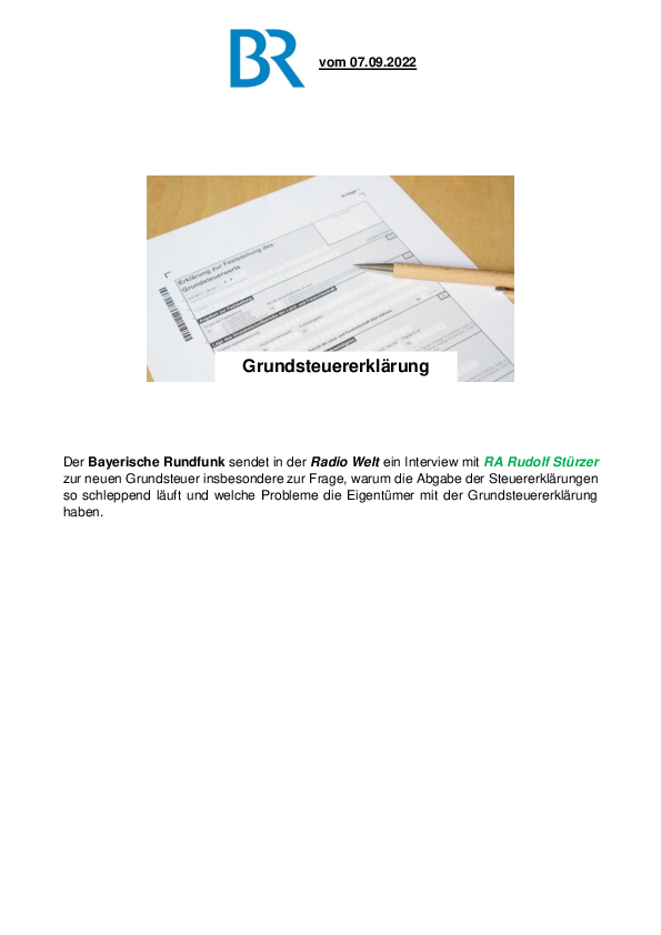 Der Bayerische Rundfunk sendet in der Radio Welt ein Interview mit RA Rudolf Stürzer zur neuen Grundsteuer insbesondere zur Frage, warum die Abgabe der Steuererklärungen so schleppend läuft und welche Probleme die Eigentümer mit der Grundsteuererklärung haben.