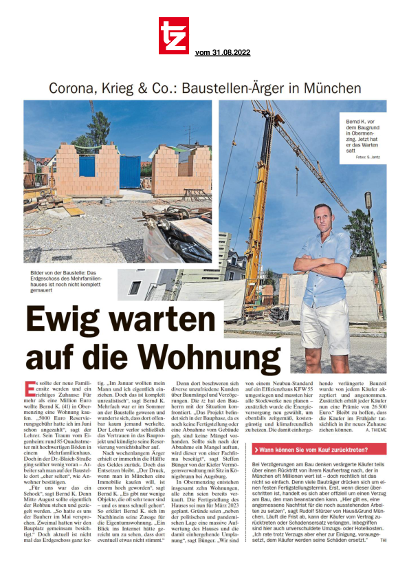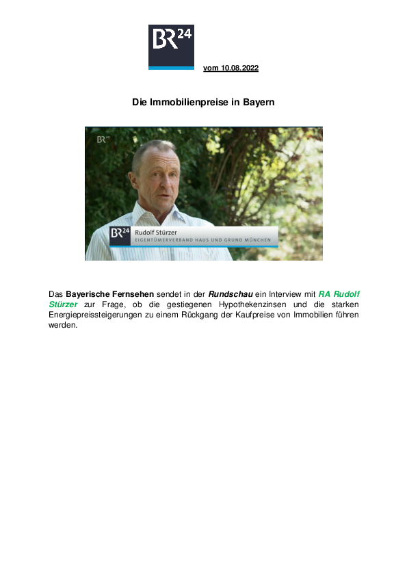 Das Bayerische Fernsehen sendet in der Rundschau ein Interview mit RA Rudolf Stürzer zur Frage, ob die gestiegenen Hypothekenzinsen und die starken Energiepreissteigerungen zu einem Rückgang der Kaufpreise von Immobilien führen werden.