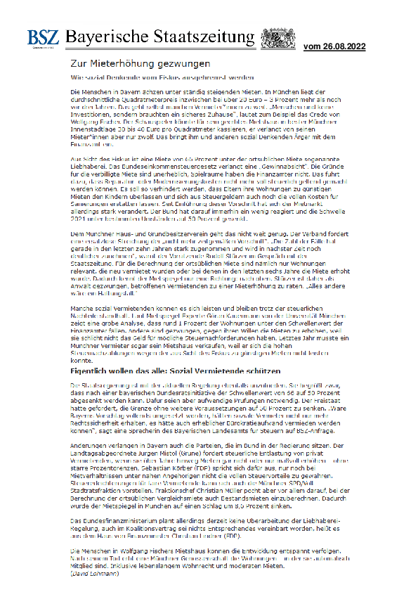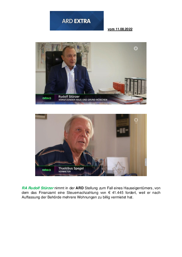 RA Rudolf Stürzer nimmt in der ARD Stellung zum Fall eines Hauseigentümers, von dem das Finanzamt eine Steuernachzahlung von € 41.445 fordert, weil er nach Auffassung der Behörde mehrere Wohnungen zu billig vermietet hat.