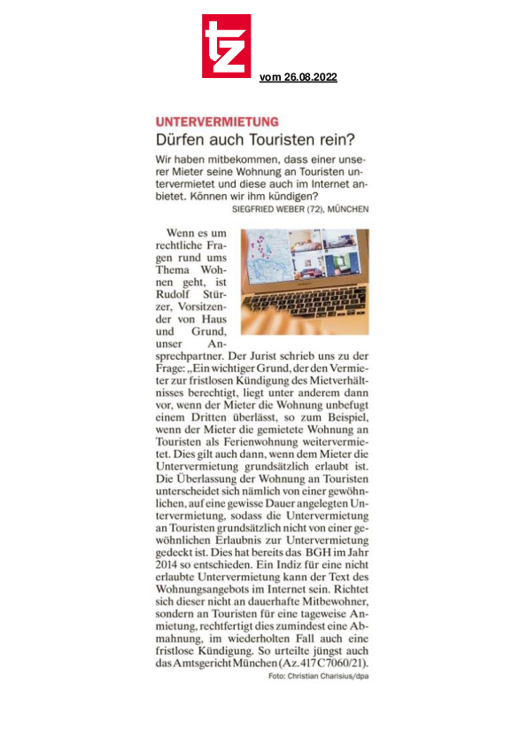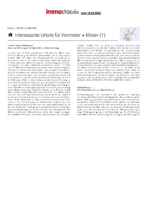 Finanzierung von Mietkosten einer Zweitwohnung berechtigt nicht zur Untervermietung // Stadtwohnung - Lärm berechtigt nicht zur Mietminderung // Fristlose Kündigung - Heilung nur bei Nachzahlung sämtlicher Rückstände // Fristlose Kündigung bei Untervermietung an Touristen // Wohngemeinschaft - Anspruch auf Auswechseln von Mietern // Eigenbedarfskündigung - Keine Sozialauswahl erforderlich // Parken auf fremdem Stellplatz - Sofortiges Abschleppen ist zulässig // Straftat in der Mietwohnung als Kündigungsgrund // Untervermietung - Gründe müssen nach Vertragsabschluss entstanden sein // Schönheitsreparaturen - Parteien können „Substandard“ vereinbaren // Wohnungsbesichtigung - Kündigung bei grundloser Verweigerung