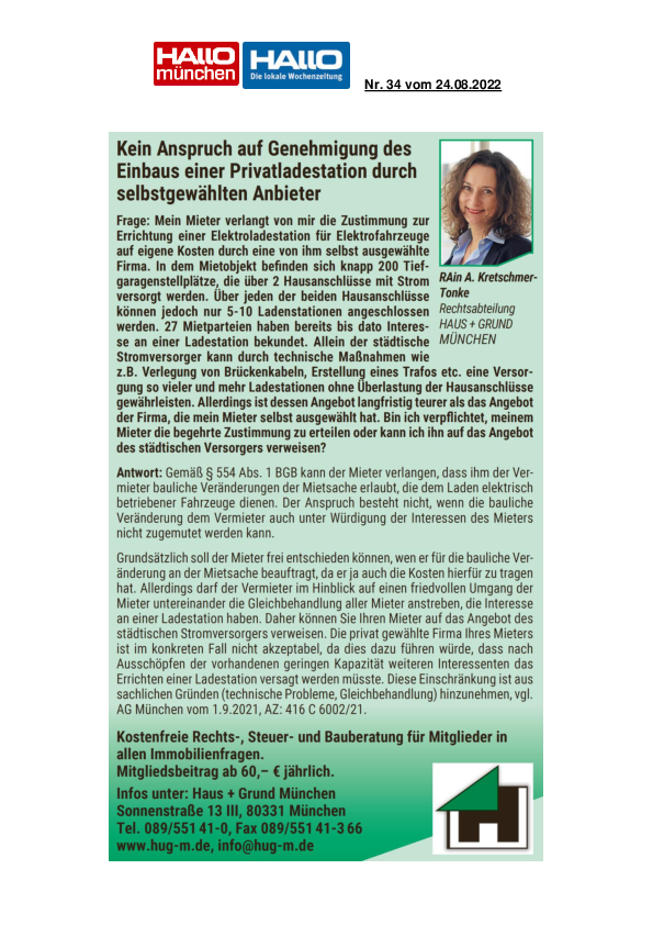 Kein Anspruch auf Genehmigung des Einbaus einer Privatladestation durch selbstgewählten Anbieter