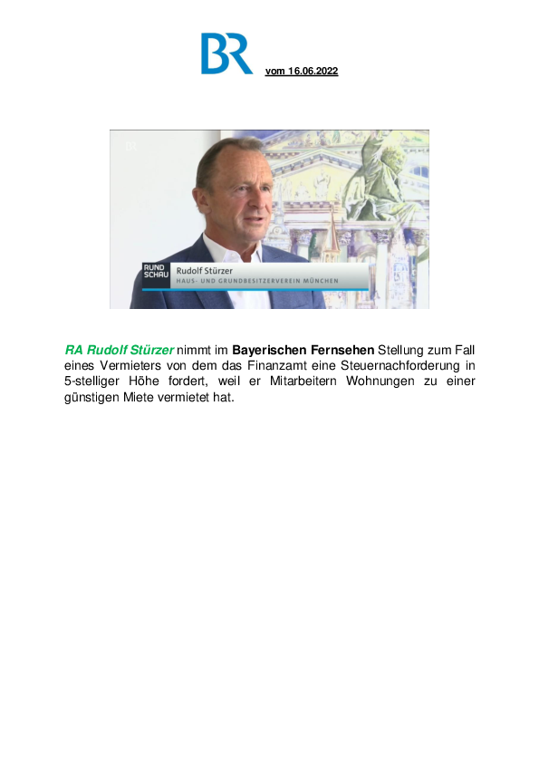 RA Rudolf Stürzer nimmt im Bayerischen Fernsehen Stellung zum Fall eines Vermieters von dem das Finanzamt eine Steuernachforderung in 5-stelliger Höhe fordert, weil er Mitarbeitern Wohnungen zu einer günstigen Miete vermietet hat.