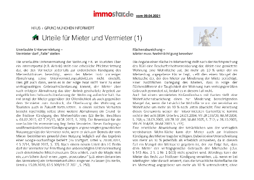 Unerlaubte Untervermietung – Vermieter darf „Falle“ stellen // Flächenabweichung – Mieter muss Beeinträchtigung beweisen // Kündigung – Querulatorisches Verhalten kann Kündigung rechtfertigen // Müllkosten – Wertstofftrennung und Nachsortieren ist umlagefähig // Zahlungsverzug – Kündigung bereits bei 1 Monat Rückstand möglich // Eigenbedarf – Kündigung für Aupair ist zulässig