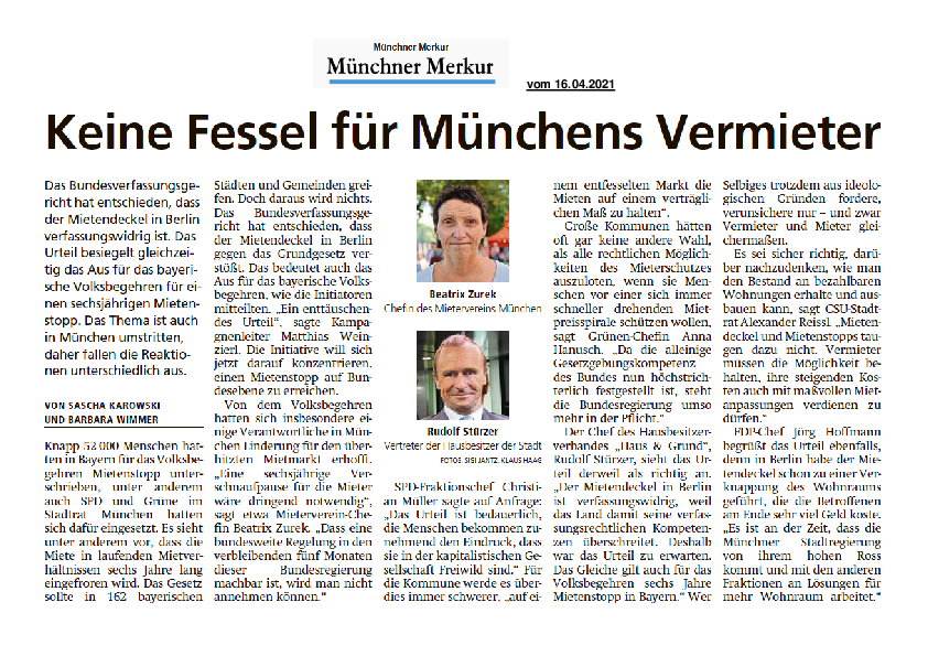 Das Bundesverfassungsgericht hat entschieden, dass der Mietendeckel in Berlin verfassungswidrig ist. Das Urteil besiegelt gleichzeitig das Aus für das bayerische Volksbegehren für einen sechsjährigen Mietenstopp. Das Thema ist auch in München umstritten, daher fallen die Reaktionen unterschiedlich aus.