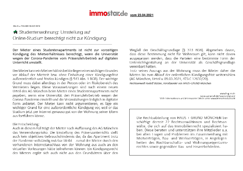 Studentenwohnung: Umstellung auf Online-Studium berechtigt nicht zur Kündigung