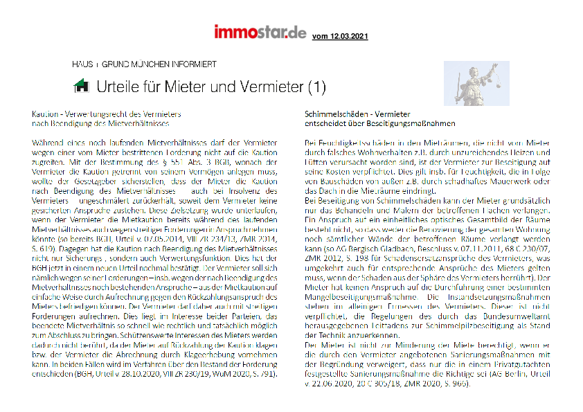 Kaution - Verwertungsrecht des Vermieters nach Beendigung des Mietverhältnisses // Schimmelschäden - Vermieter entscheidet über Beseitigungsmaßnahmen // Eigenbedarf - Mieter muss über Wegfall des Kündigungsgrundes informiert werden // Kaution - Aufrechnung nur mit gleichartigen Ansprüchen // Fernablesbare Zähler - Keine Verpflichtung zum Austausch - Missverständliche Infos von Abrechnungsfirmen // Wirtschaftliche Verwertung - Ersatzloser Abriss ist kein Kündigungsgrund