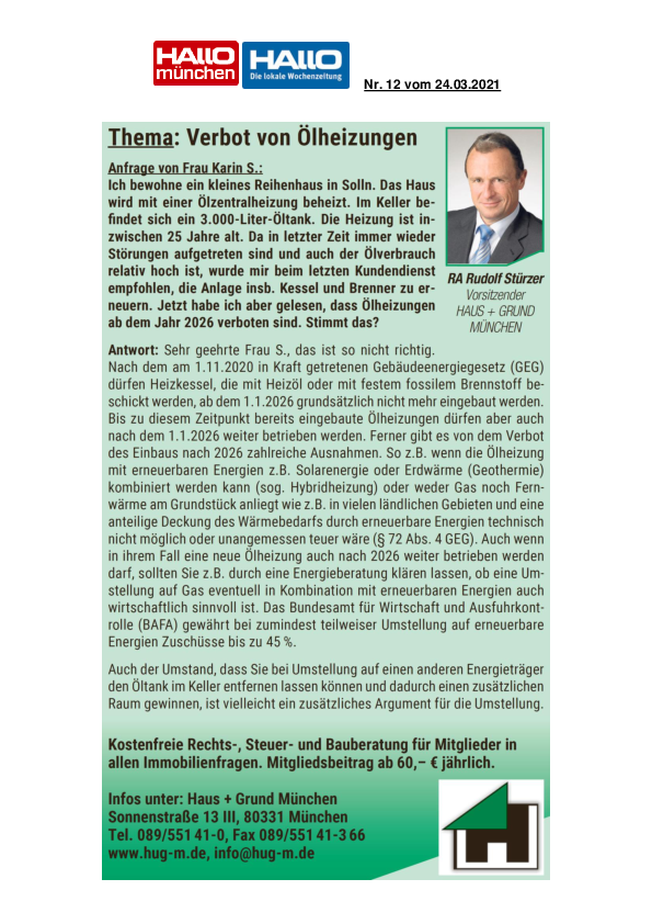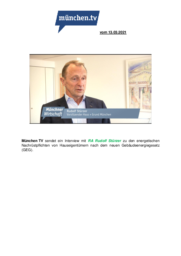 München TV sendet ein Interview mit RA Rudolf Stürzer zu den energetischen Nachrüstpflichten von Hauseigentümern nach dem neuen Gebäudeenergiegesetz (GEG).