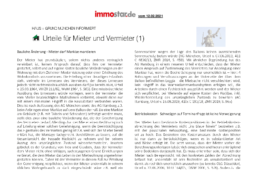 Bauliche Änderung - Mieter darf Markise montieren // Betriebskosten - Schweigen auf Terminanfrage ist keine Verweigerung // Bauliche Veränderung - Katzennetz am Balkon zulässig? // Betriebskostenabrechnung - Keine Verfristung bei Zugangsvereitelung // Betriebskostenabrechnung - Sind eingescannte Belege ausreichend? // Kündigungsschutz - Kündigung wegen Abriss setzt Zweckentfremdungsgenehmigung voraus