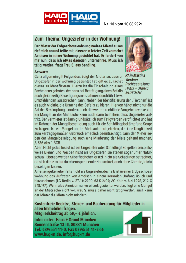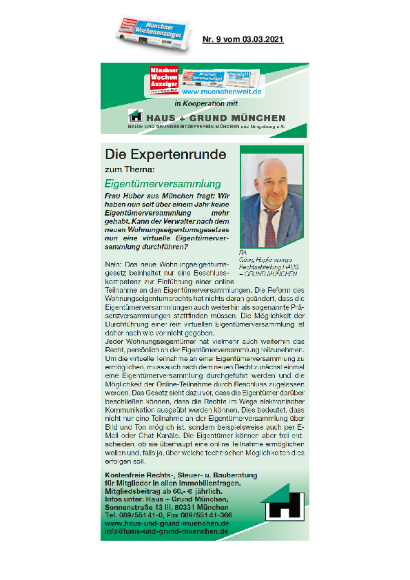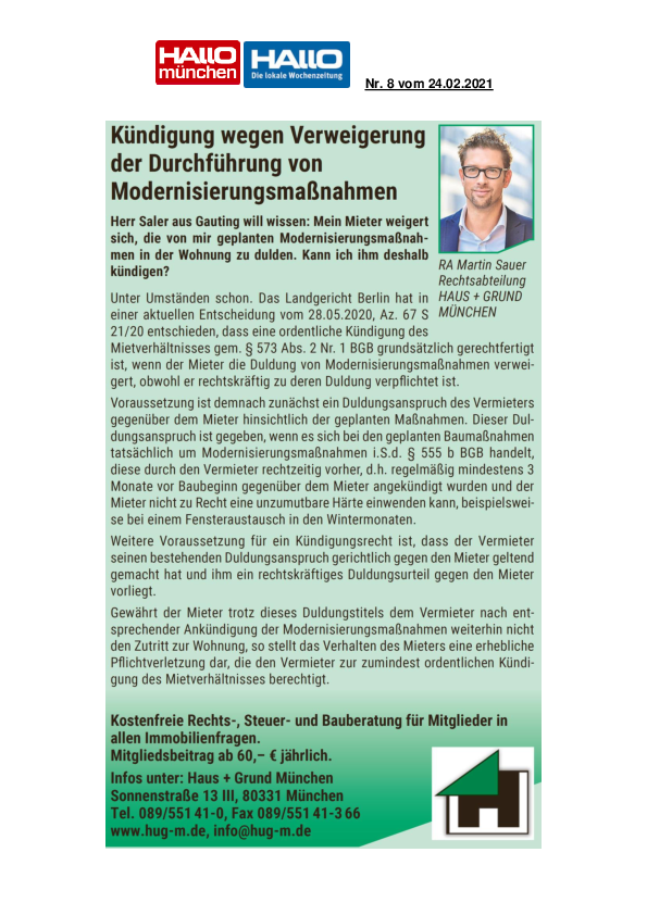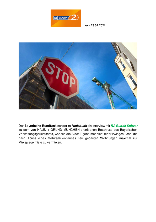 Der Bayerische Rundfunk sendet im Notizbuch ein Interview mit RA Rudolf Stürzer zu dem von HAUS + GRUND MÜNCHEN erstrittenen Beschluss des Bayerischen Verwaltungsgerichtshofs, wonach die Stadt Eigentümer nicht mehr zwingen kann, die nach Abriss eines Mehrfamilienhauses neu gebauten Wohnungen maximal zur Mietspiegelmiete zu vermieten.