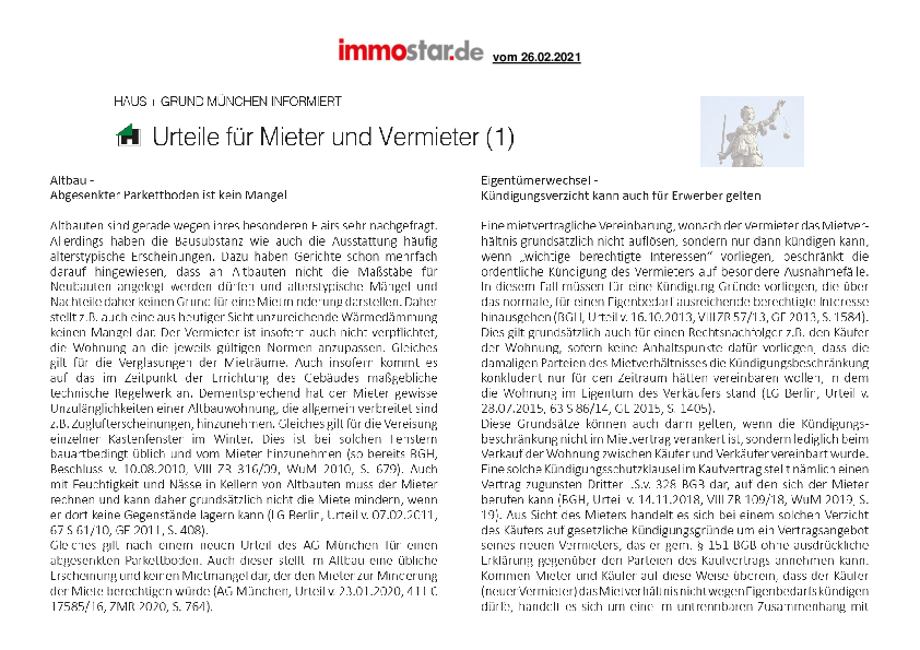 Altbau - Abgesenkter Parkettboden ist kein Mangel // Eigentümerwechsel - Kündigungsverzicht kann auch für Erwerber gelten // Kündigung des Mieters - Schwere Erkrankung kein Kündigungsgrund // Betriebskostenabrechnung - Verzicht des Mieters auf Einwendungen ist zulässig // Gewerbemiete - Umsatzsteuer auch auf Betriebskosten // Härteklausel - Gesundheitliche Beschwerden dürfen nicht bagatellisiert werden