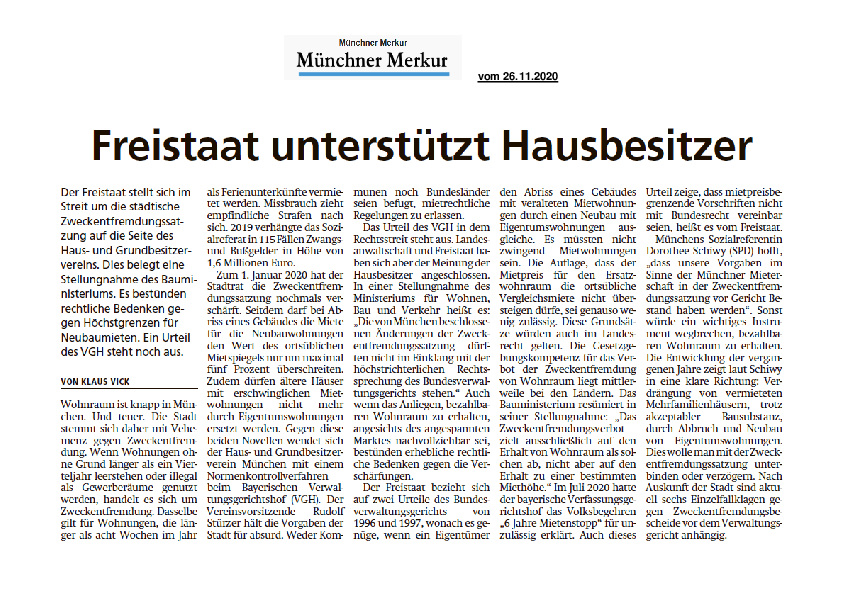 Der Freistaat stellt sich im Streit um die städtische Zweckentfremdungssatzung auf die Seite des Haus- und Grundbesitzervereins. Dies belegt eine Stellungnahme des Bauministeriums. Es bestünden rechtliche Bedenken gegen Höchstgrenzen für Neubaumieten. Ein Urteil des VGH steht noch aus.