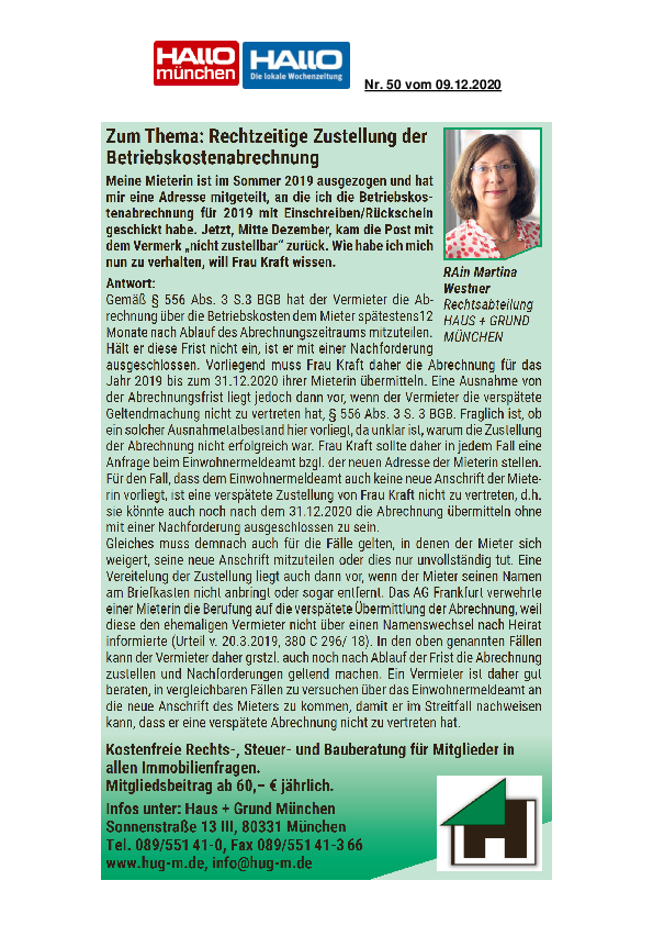 Rechtzeitige Zustellung der Betriebskostenabrechnung