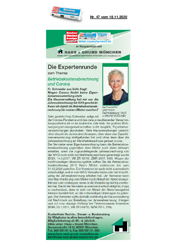 Betriebskostenabrechnung und Corona
