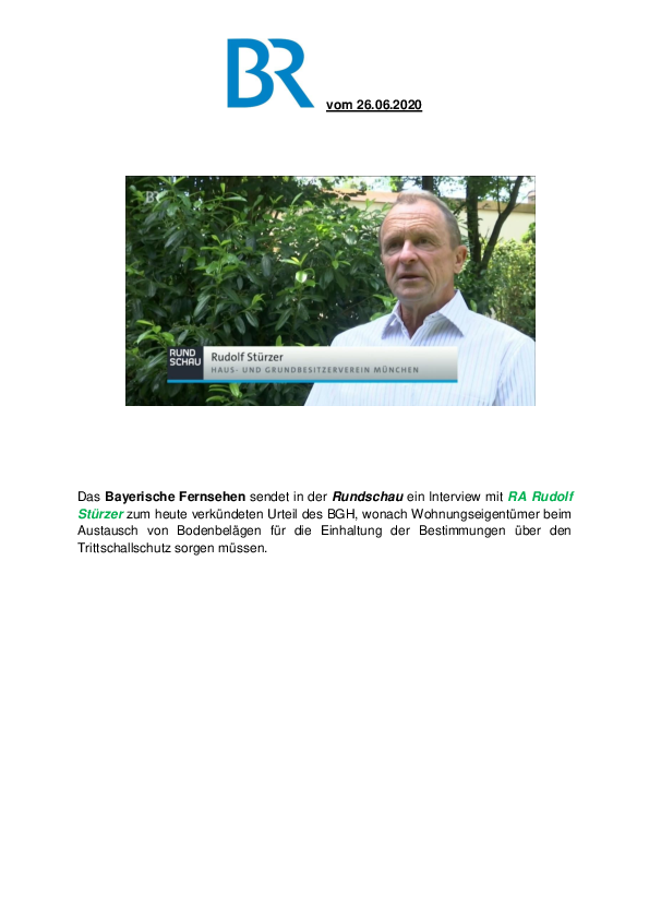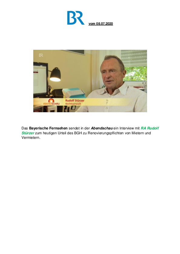 Das Bayerische Fernsehen sendet in der Abendschau ein Interview mit RA Rudolf Stürzer zum heutigen Urteil des BGH zu Renovierungspflichten von Mietern und Vermietern.