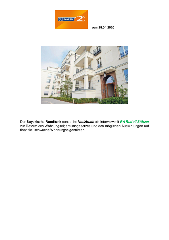 Der Bayerische Rundfunk sendet im Notizbuch ein Interview mit RA Rudolf Stürzer zur Reform des Wohnungseigentumsgesetzes und den möglichen Auswirkungen auf finanziell schwache Wohnungseigentümer.
