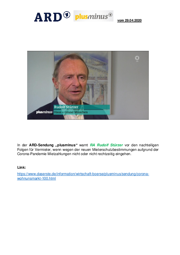 In der ARD-Sendung „plusminus“ warnt RA Rudolf Stürzer vor den nachteiligen Folgen für Vermieter, wenn wegen der neuen Mieterschutzbestimmungen aufgrund der Corona-Pandemie Mietzahlungen nicht oder nicht rechtzeitig eingehen.