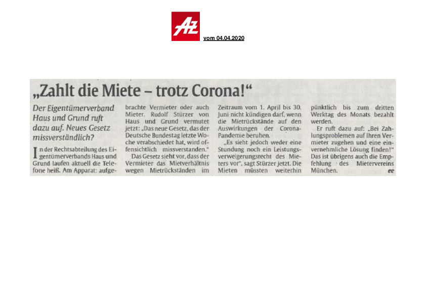 Mieter müssen pünktlich zahlen // Appell an institutionelle Vermieter // Keine einseitige Belastung der Vermieter