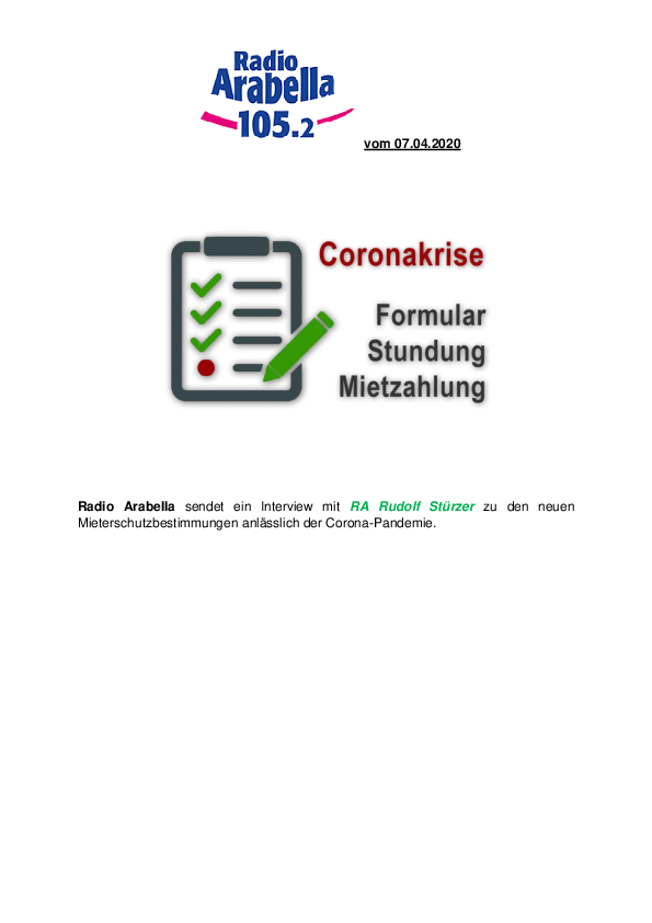 Radio Arabella sendet ein Interview mit RA Rudolf Stürzer zu den neuen Mieterschutzbestimmungen anlässlich der Corona-Pandemie.