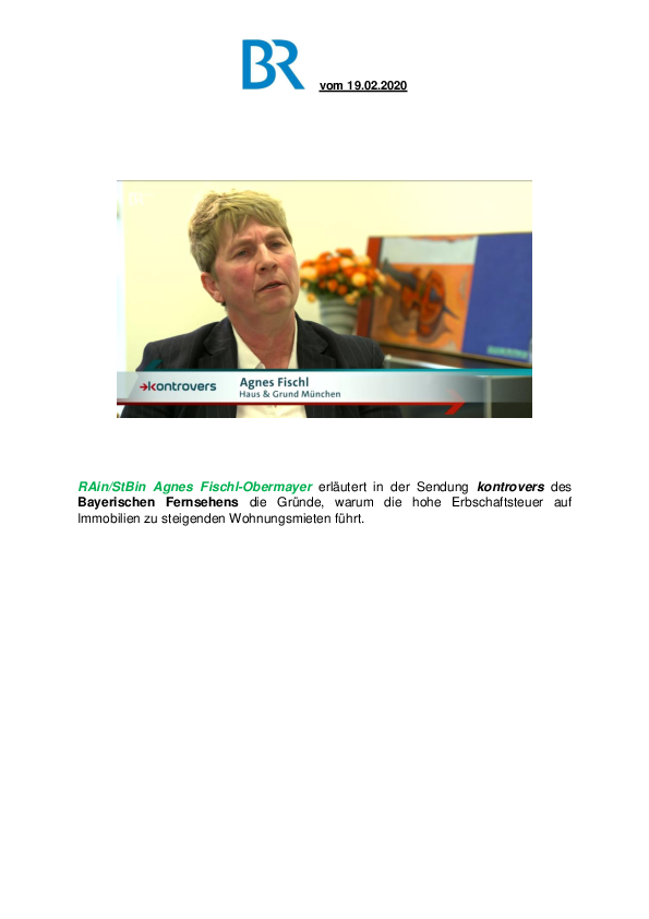 RAin/StBin Agnes Fischl-Obermayer erläutert in der Sendung kontrovers des Bayerischen Fernsehens die Gründe, warum die hohe Erbschaftsteuer auf Immobilien zu steigenden Wohnungsmieten führt.