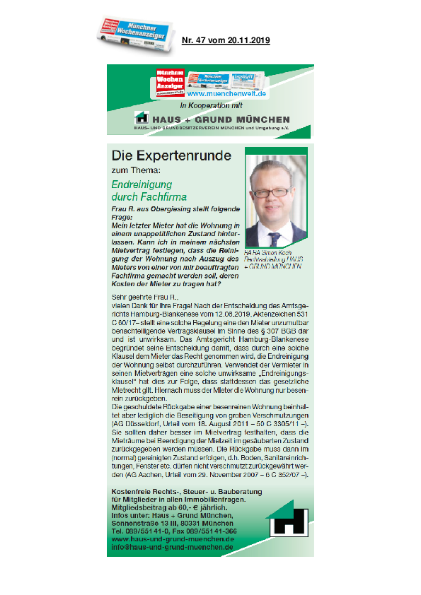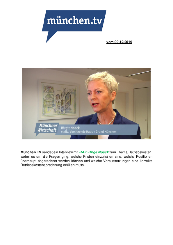 München TV sendet ein Interview mit RAin Birgit Noack zum Thema Betriebskosten, wobei es um die Fragen ging, welche Fristen einzuhalten sind, welche Positionen überhaupt abgerechnet werden können und welche Voraussetzungen eine korrekte Betriebskostenabrechnung erfüllen muss.
