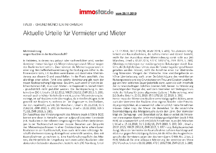 Mietminderung wegen Baulärm in der Nachbarschaft? // Falsche Angaben - Leistungsverweigerung der Versicherung darf nicht zu Lasten des Mieters gehen // Feuchtigkeit - Auch Kosten von Privatgutachten können erstattungsfähig sein