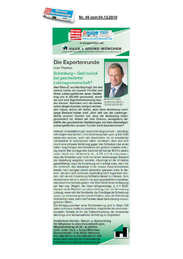 Schenkung – Geld zurück bei gescheiterter Lebensgemeinschaft?