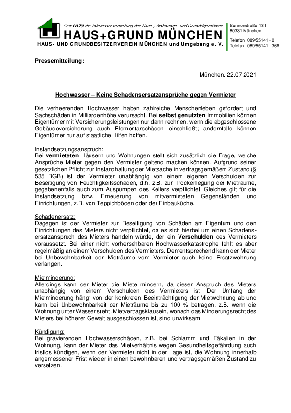 Die verheerenden Hochwasser haben zahlreiche Menschenleben gefordert und Sachschäden in Milliardenhöhe verursacht. Bei selbst genutzten Immobilien können Eigentümer mit Versicherungsleistungen nur dann rechnen, wenn die abgeschlossene Gebäudeversicherung auch Elementarschäden einschließt; andernfalls können Eigentümer nur auf staatliche Hilfen hoffen. Instandsetzungsanspruch: Bei vermieteten Häusern und Wohnungen stellt sich zusätzlich die Frage, welche Ansprüche Mieter gegen den Vermieter geltend machen können. Aufgrund seiner gesetzlichen Pflicht zur Instandhaltung der Mietsache in vertragsgemäßem Zustand (§ 535 BGB) ist der Vermieter unabhängig von einem eigenen Verschulden zur Beseitigung von Feuchtigkeitsschäden, d.h. z.B. zur Trockenlegung der Mieträume, gegebenenfalls auch zum Auspumpen des Kellers verpflichtet. Gleiches gilt für die Instandsetzung bzw. Erneuerung von mitvermieteten Gegenständen und Einrichtungen, z.B. von Teppichböden oder der Einbauküche. Schadenersatz: Dagegen ist der Vermieter zur Beseitigung von Schäden am Eigentum und den Einrichtungen des Mieters nicht verpflichtet, da es sich hierbei um einen Schadens-ersatzanspruch des Mieters handeln würde, der ein Verschulden des Vermieters voraussetzt. Bei einer nicht vorhersehbaren Hochwasserkatastrophe fehlt es aber regelmäßig an einem Verschulden des Vermieters. Dementsprechend kann der Mieter bei Unbewohnbarkeit der Mieträume vom Vermieter auch keine Ersatzwohnung verlangen. Mietminderung: Allerdings kann der Mieter die Miete mindern, da dieser Anspruch des Mieters unabhängig von einem Verschulden des Vermieters ist. Der Umfang der Mietminderung hängt von der konkreten Beeinträchtigung der Mietwohnung ab und kann bei Unbewohnbarkeit der Mieträume bis zu 100 % betragen, z.B. wenn die Wohnung unter Wasser steht. Mietvertragsklauseln, wonach das Minderungsrecht des Mieters bei höherer Gewalt ausgeschlossen ist, sind unwirksam. Kündigung: Bei gravierenden Hochwasserschäden, z.B. bei Schlamm und Fäkalien in der Wohnung, kann der Mieter das Mietverhältnis wegen Gesundheitsgefährdung auch fristlos kündigen, wenn der Vermieter nicht in der Lage ist, die Wohnung innerhalb angemessener Frist wieder in einen bewohnbaren und vertragsgemäßen Zustand zu versetzen. Wiederaufbau: Im Falle der vollständigen Zerstörung des Hauses endet das Mietverhältnis automatisch ohne Kündigung und damit die Verpflichtung des Vermieters zur Gebrauchsüberlassung (§ 275 Abs. 1 BGB). Bei nur teilweiser Zerstörung der Wohnung ist der Vermieter grundsätzlich verpflichtet, das Haus wieder aufzubauen bzw. instand zu setzen. Dies gilt jedoch nicht, wenn die aufzuwendenden Kosten die sog. „Opfergrenze“ übersteigen würden. Dies ist der Fall, wenn das Mängelbeseitigungsverlangen des Mieters treuwidrig ist, weil ein krasses Missverhältnis zwischen Reparaturaufwand einerseits und dem Nutzen der Reparatur für den Mieter sowie der Höhe der Miete andererseits besteht und die Mangelhaftigkeit nicht vom Vermieter verschuldet worden ist (so bereits OLG Hamburg, Urteil vom 8.11.2000, 4 U 205/99, WUM 2001, S. 542). Unzumutbar ist der Renovierungsaufwand nach der Rechtsprechung für den Vermieter allerdings erst dann, wenn er nicht innerhalb eines Zeitraums von 10 Jahren durch eine erzielbare Rendite aus dem Mietobjekt ausgeglichen werden kann (so OLG Hamburg, Urteil vom 6.9.2002, 4 U 15/00, GE 2001, S. 1266) oder der Reparaturaufwand mehr als das Dreifache des Verkehrswertes des Mietobjekts betragen würde (so BGH, Urteil vom 21.4.2010, VIII ZR 131/09; zur „Opfergrenze“ siehe auch Vermieter-Lexikon Stürzer/Koch, Stichwort „Instandhaltung und Instandsetzung der Mieträume“). Rechtsanwalt Rudolf Stürzer Vorsitzender HAUS + GRUND MÜNCHEN