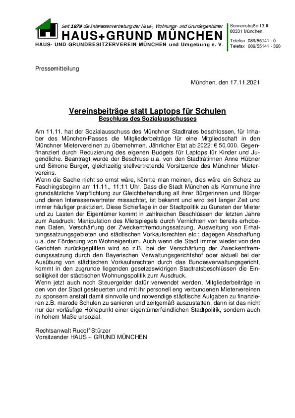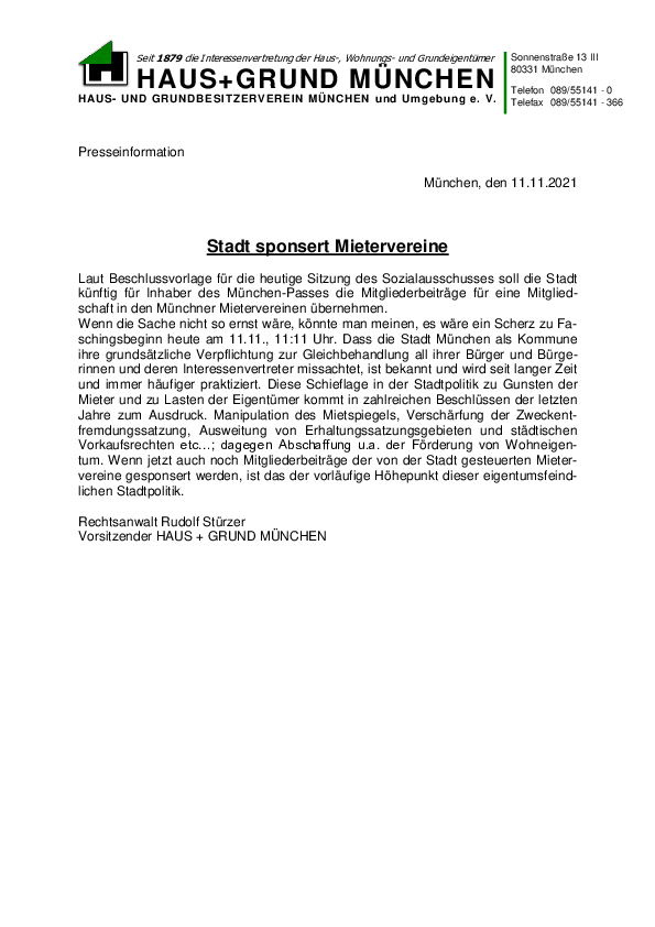 Laut Beschlussvorlage für die heutige Sitzung des Sozialausschusses soll die Stadt künftig für Inhaber des München-Passes die Mitgliederbeiträge für eine Mitgliedschaft in den Münchner Mietervereinen übernehmen. Wenn die Sache nicht…