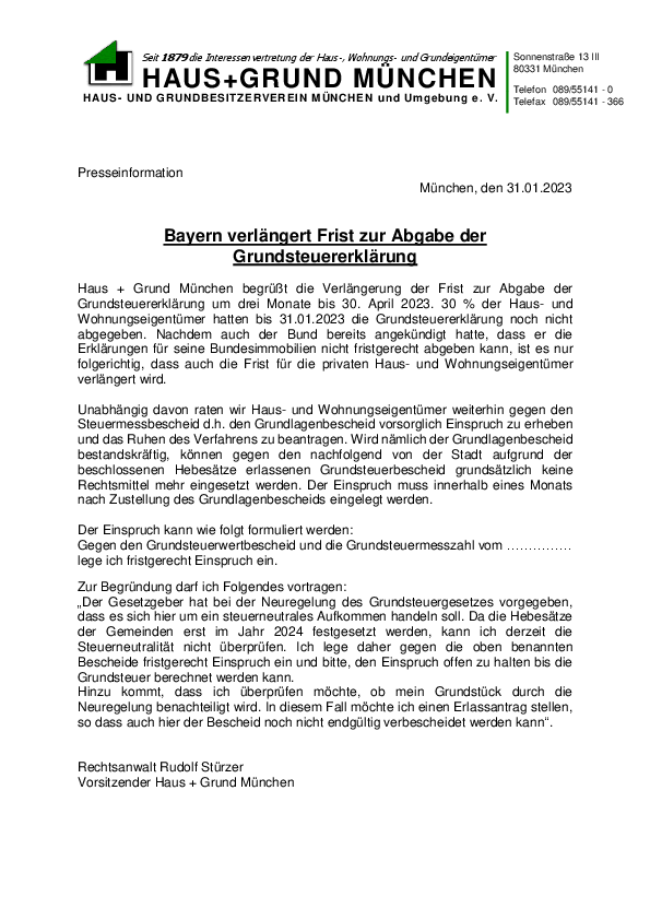Haus + Grund München begrüßt die Verlängerung der Frist zur Abgabe der Grundsteuererklärung um drei Monate bis 30. April 2023. 30 % der Haus- und Wohnungseigentümer hatten bis 31.01.2023 die…