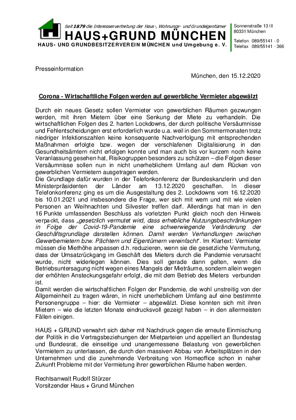 Corona – Wirtschaftliche Folgen werden auf gewerbliche Vermieter abgewälzt