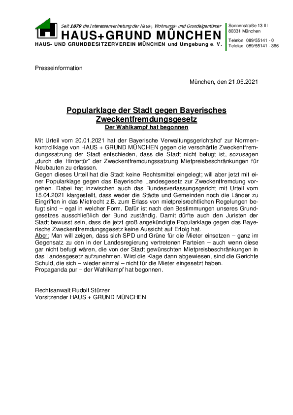 Popularklage der Stadt gegen Bayerisches Zweckentfremdungsgesetz