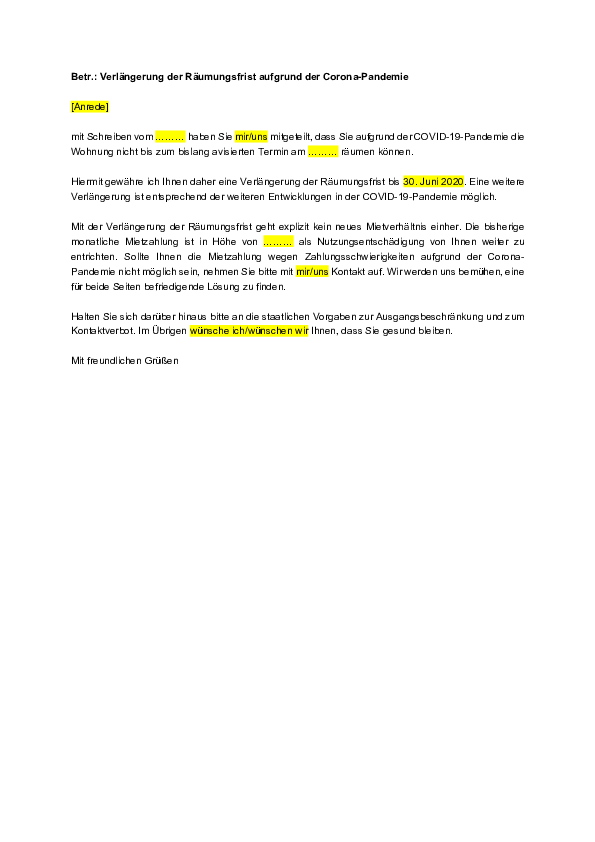 Betr.: Verlängerung der Räumungsfrist aufgrund der Corona-Pandemie Anrede mit Schreiben vom ……… haben Sie mir/uns mitgeteilt, dass Sie aufgrund der COVID-19-Pandemie die Wohnung nicht bis zum bislang avisierten Termin am…