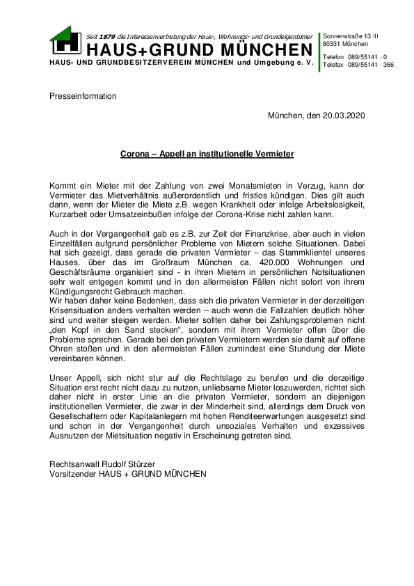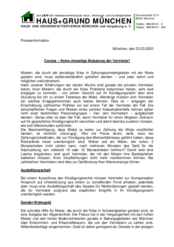 Corona – Keine einseitige Belastung der Vermieter!