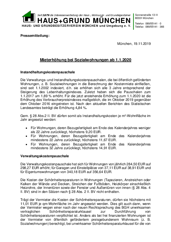 Mieterhöhung bei Sozialwohnungen ab 1.1.2020