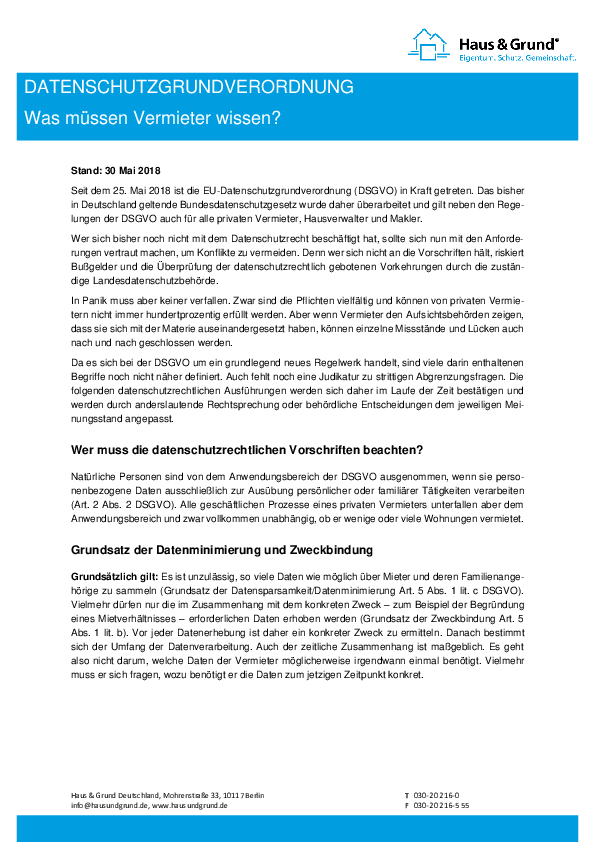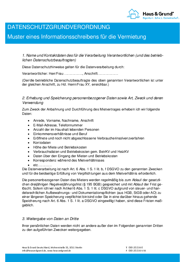 Datenschutzgrundverordnung — Muster eines Informationsschreibens für die Vermietung