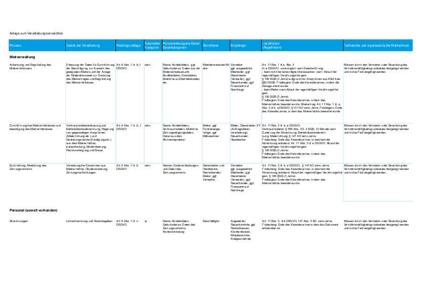 Datenschutzgrundverordnung — Anlage zum Verarbeitungsverzeichnis