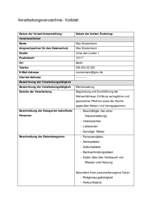 Datenschutzgrundverordnung — Vorblatt – Verarbeitungsverzeichnis