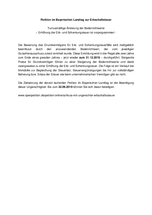 Petition im Bayerischen Landtag zur Erbschaftsteuer