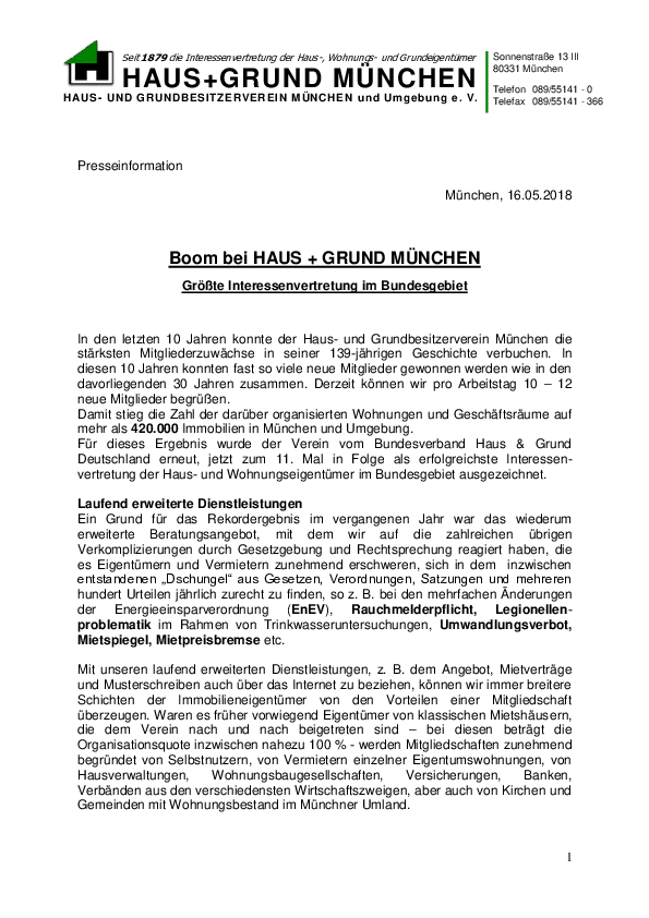 Zum 11.Mal in Folge wurde der Haus- und Grundbesitzerverein München als erfolgreichste Interessenvertretung der Haus-, Wohnungs- und Grundeigentümer ausgezeichnet. Im Geschäftsjahr 2017 konnte die Zahl der Mitglieder um 1.102 auf…