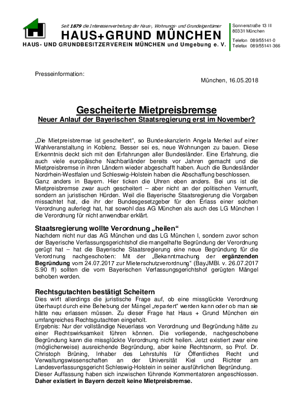 „Die Mietpreisbremse ist gescheitert“, so Bundeskanzlerin Angela Merkel auf einer Wahlveranstaltung in Koblenz. Besser sei es, neue Wohnungen zu bauen. Diese Erkenntnis deckt sich mit den Erfahrungen aller Bundesländer. Eine Erfahrung, die auch viele europäische Nachbarländer bereits vor Jahren gemacht und die Mietpreisbremse in ihren Ländern wieder abgeschafft haben. Auch die Bundesländer Nordrhein-Westfalen und Schleswig-Holstein haben die Abschaffung beschlossen. Ganz anders in Bayern. Hier ticken die Uhren eben anders. Bei uns ist die Mietpreisbremse zwar auch gescheitert – aber nicht an der politischen Vernunft, sondern an juristischen Hürden. Weil die Bayerische Staatsregierung die Vorgaben missachtet hat, die ihr der Bundesgesetzgeber für den Erlass einer solchen Verordnung auferlegt hat, hat sowohl das AG München als auch des LG München I die Verordnung für nicht anwendbar erklärt.