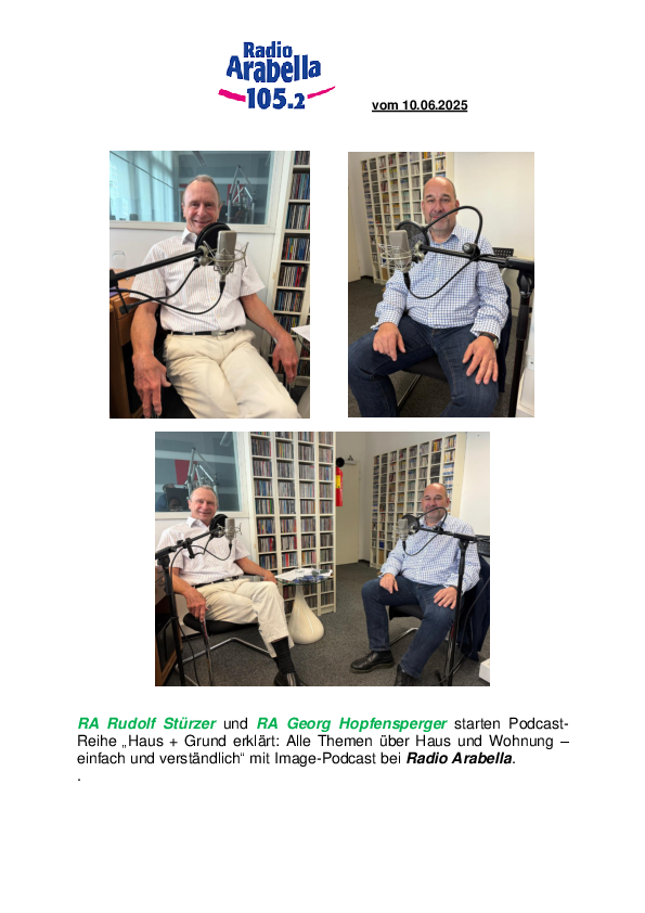 RA Rudolf Stürzer und RA Georg Hopfensperger starten Podcast-Reihe „Haus + Grund erklärt: Alle Themen über Haus und Wohnung – einfach und verständlich“ mit Image-Podcast bei Radio Arabella.