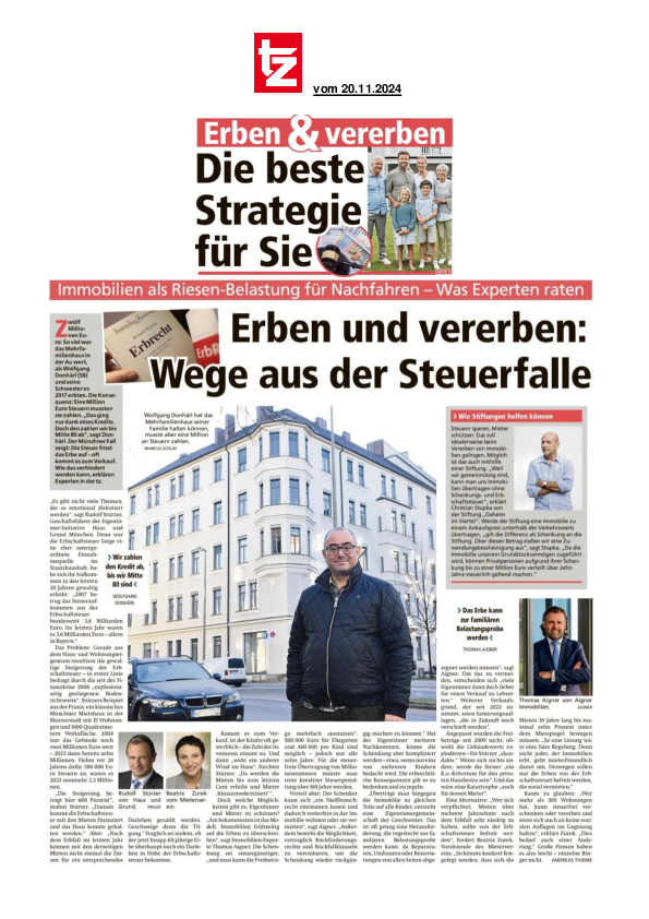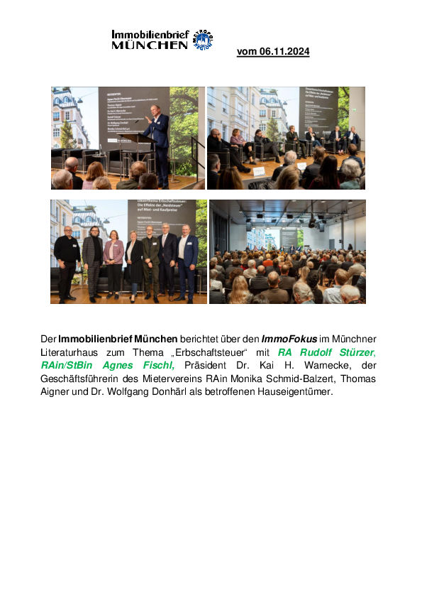 Der Immobilienbrief München berichtet über den ImmoFokus im Münchner Literaturhaus zum Thema „Erbschaftsteuer“ mit RA Rudolf Stürzer, RAin/StBin Agnes Fischl, Präsident Dr. Kai H. Warnecke, der Geschäftsführerin des Mietervereins RAin Monika Schmid-Balzert, Thomas Aigner und Dr. Wolfgang Donhärl als betroffenen Hauseigentümer.